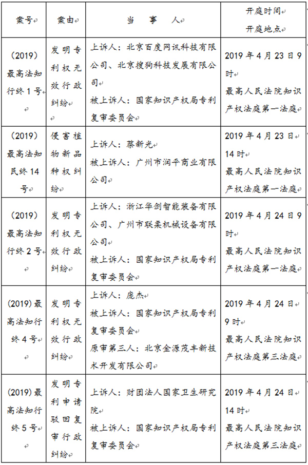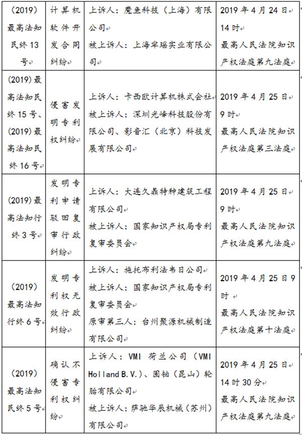 最高人民法院定于2019年4月23日至4月25日公开开庭审理下列案件: