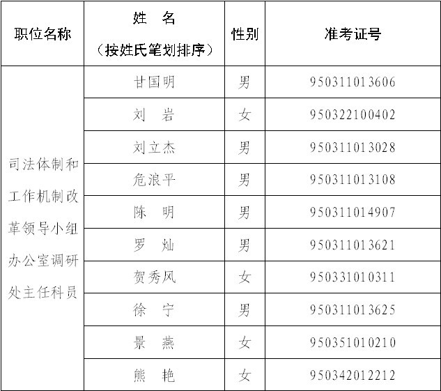 根据笔试成绩,按1:5比例,确定以下10名人选进入职位业务水平测试和面试(如有放弃,依次递补):