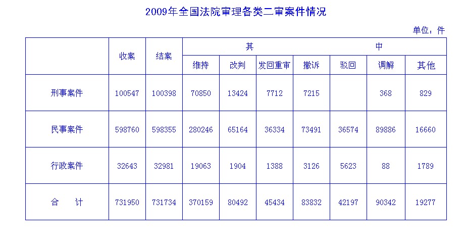 2009年全国法院审理各类二审案件情况统计表