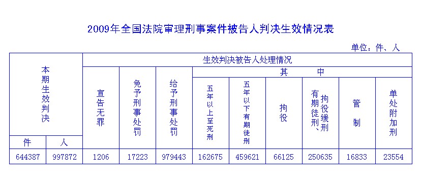 2009年全国法院审理刑事案件被告人判决生效情况统计表