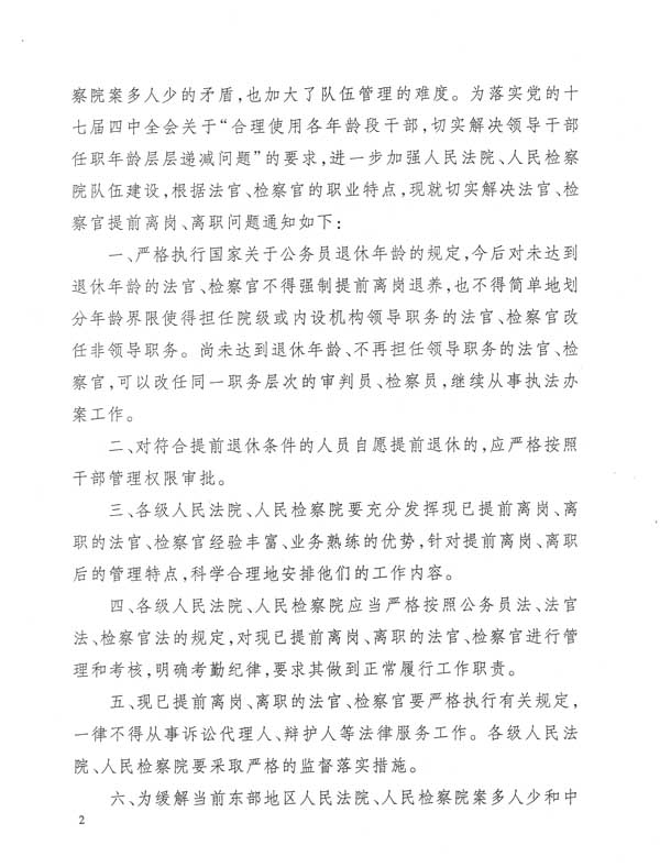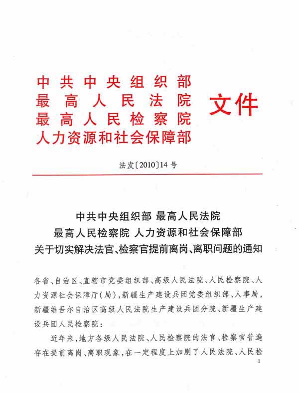 中共中央组织部 最高人民法院 最高人民检察院 人力资源和社会保障部 关于切实解决法官、检察官提前离岗、离职问题的通知