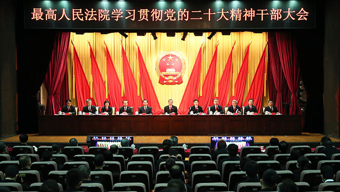 10月24日上午,最高人民法院举行学习贯彻党的二十大精神干部大会,最高人民法院党组书记、院长周强出席会议并讲话。周强强调,要坚持以习近平新时代中国特色社会主义思想为指导,深入贯彻习近平法治思想,深入学习宣传贯彻党的二十大精神,认真贯彻落实党的二十届一中全会精神,深刻领悟“两个确立”的决定性意义,增强“四个意识”、坚定“四个自信”、做到“两个维护”,扎实工作、锐意进取,奋力推进新时代新征程人民法院工作高质量发展,为推进中国式现代化提供有力司法服务,为全面建设社会主义现代化国家、全面推进中华民族伟大复兴作出新的更大贡献。