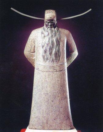 墨玉石雕《包青天》是郝京平先生1989年创作的作品,在全国第七届美展中获铜奖。整座雕塑线条简练、朴素,流畅而有厚重感,面部经过琢磨处理,使得整座雕塑只有面部与胡须颜色为黑色,与其他部分均为原石的青白本色形成鲜明对比,相得益彰。黝黑的面部表情严肃,目光不怒自威,把包拯的威严、正直、刚正不阿完美地展示给观者。