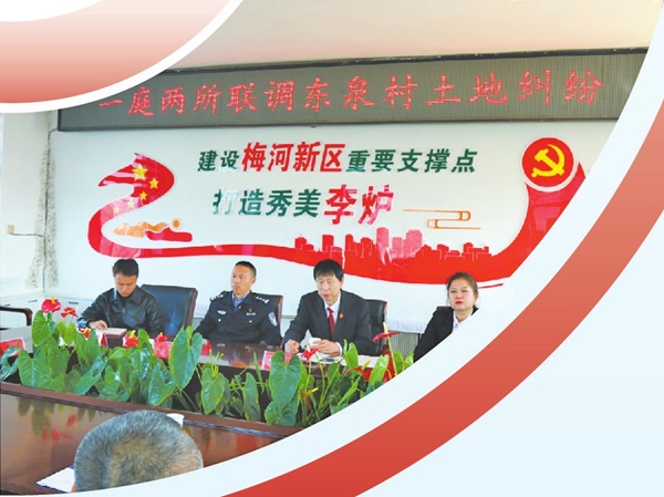 图③:梅河口法院法官依托“一庭两所”机制调处土地纠纷。