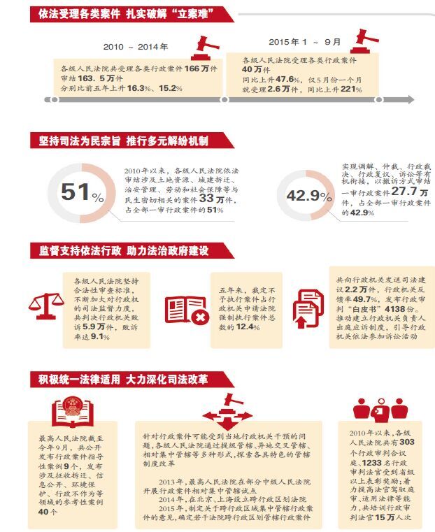 行政审判是解决行政争议的重要途径,是党在司法领域联系人民群众、实现依法执政的重要方式,在保护人民群众合法权益,监督行政机关依法行政,保证法律统一正确实施等方面发挥着不可替代的重要作用。2010年以来,人民法院围绕“努力让人民群众在每一个司法案件中感受到公平正义”的目标,坚持司法为民、公正司法,充分发挥行政审判职能,依法妥善化解行政纠纷,着力解决行政审判突出问题,进一步完善行政诉讼体制机制,推动行政审判工作不断取得新进展。