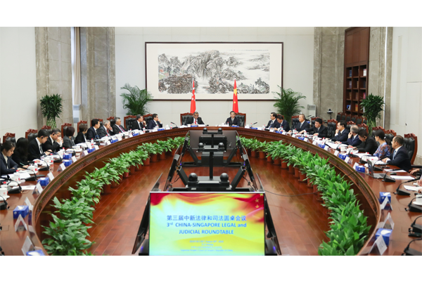 周强表示,中新法律和司法圆桌会议作为双边法律司法合作和“一带一路”合作的重要平台,以司法合作助推全方位合作,有力促进了双方各项务实合作的开展,在造福两国人民、推动区域和平稳定发展中发挥着重要作用。希望中新两国司法界秉持开放包容的合作精神,坚持平等务实的合作理念,深化在法官培训、人员交流等方面的合作,充分发挥中新法律和司法圆桌会议平台机制作用,在服务高质量共建“一带一路”等领域携手共进,推动形成更多互利共赢的合作成果,为促进地区和平发展、构建人类命运共同体提供有力司法服务和保障。