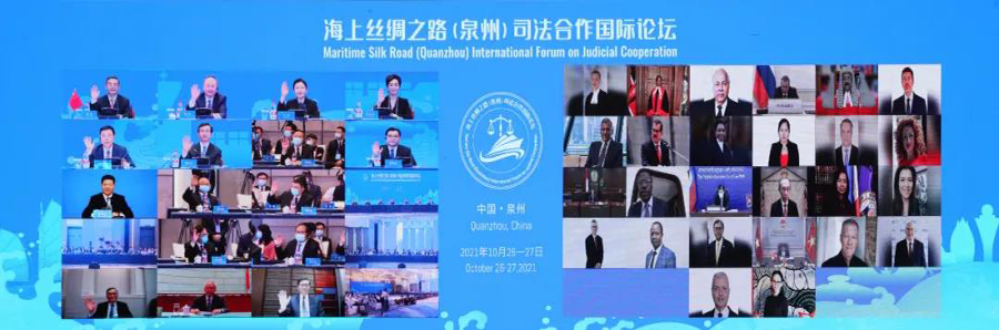 10月26日下午,海上丝绸之路(泉州)司法合作国际论坛在福建泉州开幕。本次论坛由中国最高人民法院主办,以线上线下相结合的方式举行,与会代表围绕“加强司法合作推动共赢发展”主题深入交流。中华人民共和国首席大法官、最高人民法院院长周强出席论坛开幕式并致辞表示,希望传承和发扬丝路精神,深化“一带一路”沿线国家司法交流合作,广泛凝聚共识,加强交流互鉴,为高质量共建“一带一路”、构建人类命运共同体提供有力司法服务。
