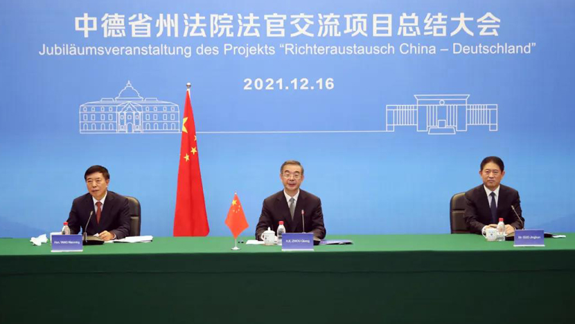 12月16日下午,中德省州法院法官交流项目总结大会以视频方式举行,中华人民共和国首席大法官、最高人民法院院长周强,德国联邦最高法院院长林佩阁出席开幕式并致辞。