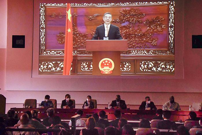 图为周强在古巴第十届国际司法与法律大会闭幕式上以视频方式致辞。新华社照片