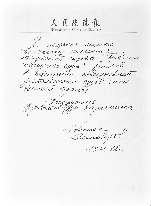 题词译文: 我衷心祝愿人民法院报社的全体工作人员在对贵国这一伟大国家的司法事业的报