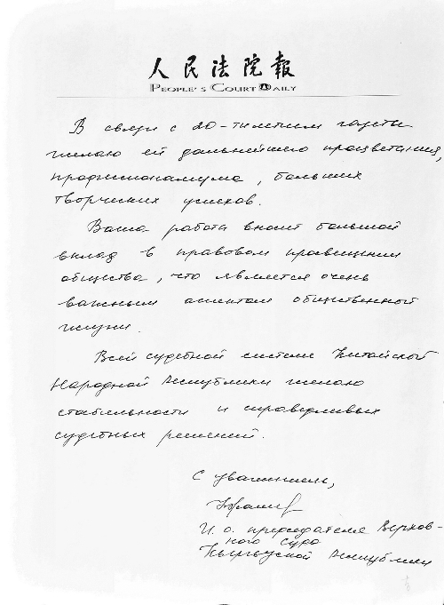 题词译文:值贵报20周年之际,祝愿贵报事业蒸蒸日上,在未来的工作中更专业,取得进一步的创造性成果。你们的工作对社会法制教育这一社会生活的重要方面作出了突出的贡献。祝愿中华人民共和国的法制体系司法判决更加稳定和公正。 贾马舍娃·费鲁扎