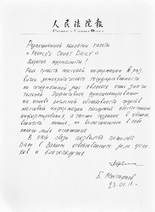 人物介绍: 穆斯塔法耶夫·布里托什·穆斯塔法耶维奇,乌兹别克斯坦共和国最高法院院长。 1966年至1971年在塔什干国立大学学习。1971年至1985年曾任萨马尔汗州检察院调查科检察官、纳尔佩市检察院调查员、阿克塔什市法院法官、占贝市检察院检察官、州副检察官、州第一副检察官。1985年至1989年任安迪坚州州检察官。1989年至2002年任乌兹别克斯坦共和国副检察官、检察官、检察长、总统国务顾问副手、司法部副部长。2002年至2004年任宪法法院院长。2004年至2005年任中央选举委员会主席。2005年至2006年任司法部部长。2006年至今任最高法院院长。 2012年4月23日下午,记者采访了乌兹别克斯坦最高法院院长穆斯塔法耶夫。 穆斯塔法耶夫介绍,乌兹别克斯坦是个年轻的国家,成立于1991年。成立后的第一件事就是确立宪法,改革就是从那时开始的。第二件事是通过了16项新法律条款,其中包括一些关于法院工作的条款,这些条款当中规定了不同法院的不同职责,其中就包括了宪法法院、最高法院、经济法院、中央法院、州法院等一系列其他的法院,改革包括了刑事改革、民事改革、行政改革,这些改革都是为了使司法程序更加民主化、轻缓化。 另外,应该是乌兹别克斯坦一个特有的法庭“经济产业法庭”,也进行了改革,这个法庭将会处理一切涉及经济产业的案件。宪法法院会处理一切有关宪法的案件,也进行了改革。 这些法院在审理案件时是很审慎的,假如经过审判认为被告没有犯罪,就会立刻释放这些人。 “在乌兹别克斯坦,现在只有法院有权批准逮捕,检察官无权批准。”穆斯塔法耶夫补充道,“乌兹别克斯坦司法体系的改革将会继续下去。” 上合组织成员国最高法院院长会议已召开了六届,而去年就是在乌兹别克斯坦首都塔什干召开的。穆斯塔法耶夫说,上合院长会议有益于成员国之间相互学习,尤其是可以向中国学习很多有益的经验,我们会就中国的经验当中吸取一些适合本国现实情况的经验来学习,这对于我们来说也是一种推动力。他进一步解释说,“别的国家的司法改革成效和取得的成果,可以激励我们在本国将司法改革继续进行下去。” 最后,穆斯塔法耶夫表示,在乌兹别克斯坦居住和生活着很多中国人,乌兹别克斯坦的法律和法院会竭尽全力地帮助他们在乌更好地工作和生活,比如一些中国商人和企业家,我们将更好地保障他们的经济权利。同时,乌兹别克斯坦也有很多人在中国工作和生活,中国的法律和司法体系也在全力地维护他们在中国的合法利益,在这一点上,两个国家互相交流、相互切磋,让两国人民在对方国家更好地工作和生活。 采访结束后,他从果盘中取一些果品一一递给翻译、摄影和文字记者,“你们尝尝,很好吃的!”随后他拿出已写好的题词认真地读给记者听,并在题词的最后签下了自己的名字。 题词译文:致人民法院报同事们 亲爱的记者朋友们:如今媒体在国家民主发展过程中发挥着十分重要的作用。媒体的客观性有利于保障信息的准确,并避免产生任何曲解。因此,我祝愿贵报在这项意义重大且极富责任感的事业中取得可喜成就、一切顺利。 穆斯塔法耶夫