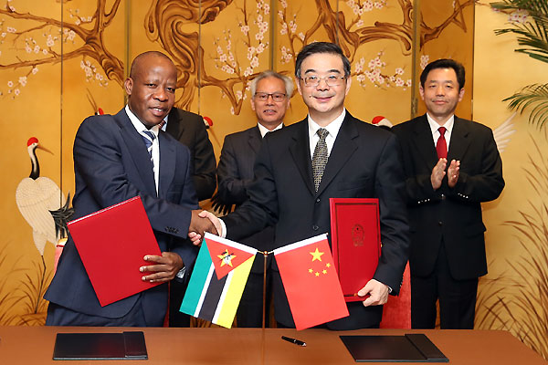 图为 周强与莫桑比克最高法院院长安德利诺•曼努埃尔•穆尚加共同签署《中华人民共和国最高人民法院与莫桑比克共和国最高法院司法交流与合作谅解备忘录》。孙若丰 摄