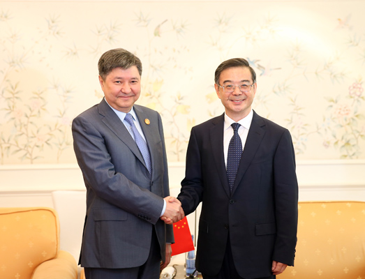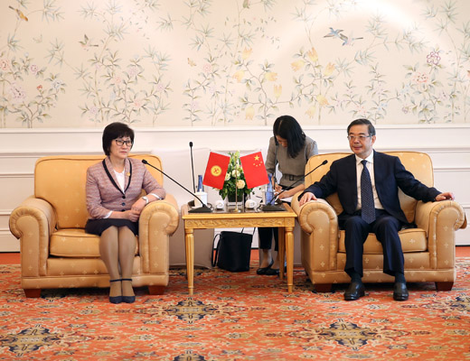 图为周强会见吉尔吉斯共和国最高法院院长艾娜什·托克巴耶娃。