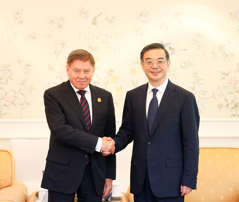 图为周强会见俄罗斯联邦最高法院院长维亚切斯拉夫·列别杰夫。