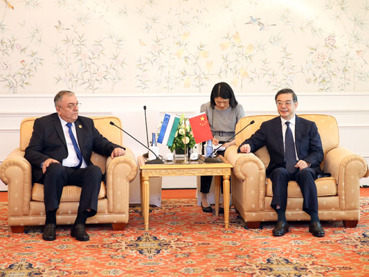 图为周强会见乌兹别克斯坦共和国最高法院院长科济姆占·卡米洛夫。