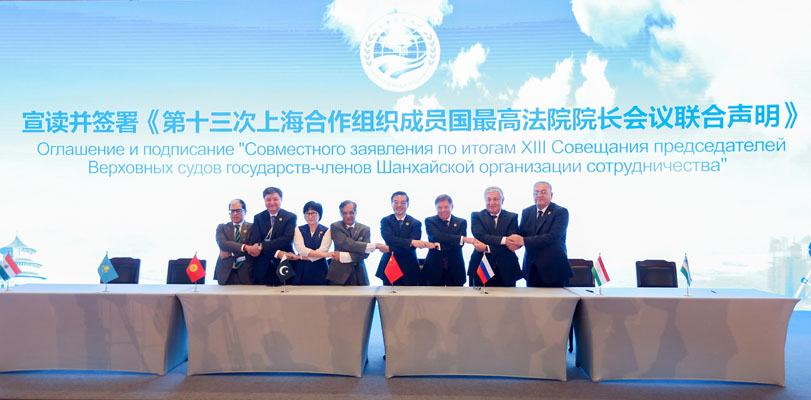 经与会各方认真磋商,会议通过《第十三次上海合作组织成员国最高法院院长会议联合声明》(以下简称《联合声明》)。《联合声明》指出,上海合作组织成员国最高法院之间的司法交流与合作,有助于维护本地区的持久和平、安全与稳定,提升各成员国之间的相互信任与睦邻友好关系。各成员国与会者,愿意加强和深化司法合作,合力打击跨境犯罪,完善解决国际民商事纠纷的手段。《联合声明》强调,成员国最高法院应遵循“互信、互利、平等、协商,尊重多样文明,谋求共同发展”的“上海精神”,相互借鉴有益经验,提升司法信息化水平,加强合作,巩固本地区和平、维护全球安全稳定。《声明》就加强典型案例、裁判文书等信息交流,健全完善本国非法证据排除制度,促进跨境货物买卖法律规则的协调统一,开展法官之间的交流互访和加强法官培训等达成广泛共识,提出了具体目标和措施。