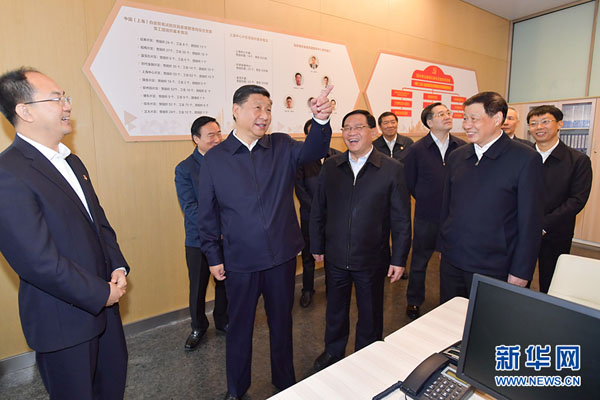 11月6日至7日,习近平在出席首届中国国际进口博览会开幕式和相关活动后,在中共中央政治局委员、上海市委书记李强和市长应勇陪同下,深入上海的企业、社区、城市运行综合管理中心、高新科技园区,就贯彻落实党的十九大精神和当前经济形势、推进科技创新、加强城市管理和社区治理进行调研。