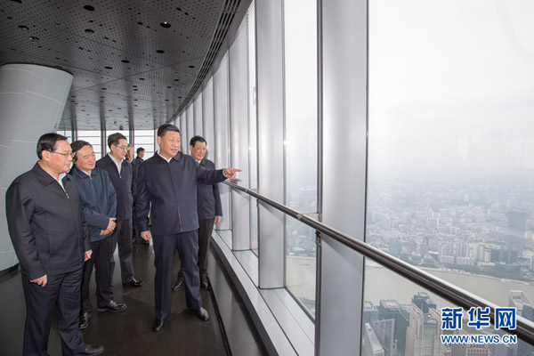 这是习近平在上海中心大厦119层观光厅俯瞰上海城市风貌。 新华社记者 李学仁 摄
