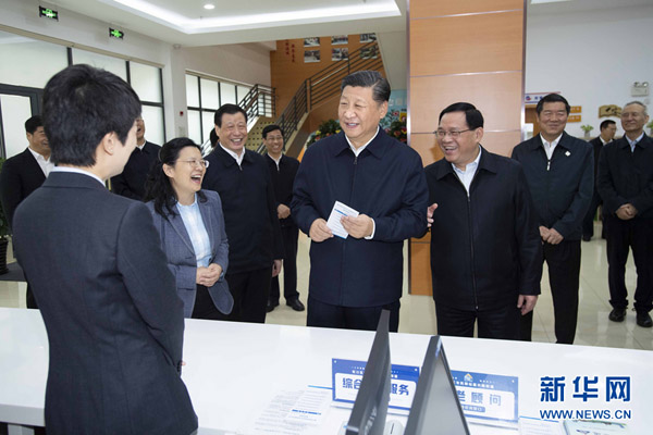 这是习近平在位于上海市浦东新区陆家嘴的上海中心大厦,视察陆家嘴金融城党建服务中心,了解城市楼宇党建工作情况。 新华社记者 谢环驰 摄