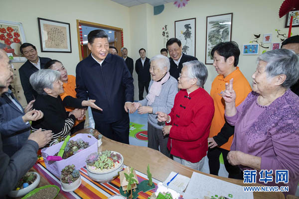 这是习近平在虹口区市民驿站嘉兴路街道第一分站托老所同老年居民亲切交谈。 新华社记者 李涛 摄