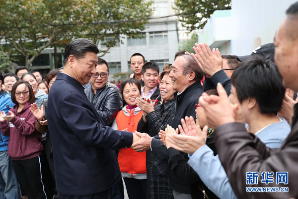 这是习近平在虹口区市民驿站嘉兴路街道第一分站托老所同老年居民亲切握手。 新华社记者 谢环驰 摄