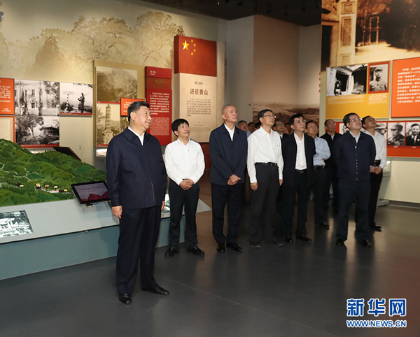 离开来青轩,习近平来到香山脚下的香山革命纪念馆,参观了《为新中国奠基——中共中央在北京香山》主题展览。新建成的纪念馆庄重大气,“四梁八柱”的雨棚造型寓意党中央在香山为新中国搭建四梁八柱。28根廊柱,象征中国共产党从建党到建立新中国28年的奋斗历程。南广场上矗立着高19.49米的国旗杆,寓意中华人民共和国诞生于1949年。主题展览由“进京‘赶考’”、“进驻香山”、“继续指挥解放全中国”、“新中国筹建”、“不忘初心、牢记使命、永远奋斗”5个部分组成,按历史脉络,通过800多张图片、报照、地图、表格和1200多件实物、文献和档案,全景式生动呈现中共中央在香山期间领导全国各族人民,完成民族独立和人民解放的历史使命、开启中国历史发展新纪元的光辉历程。