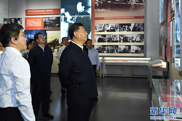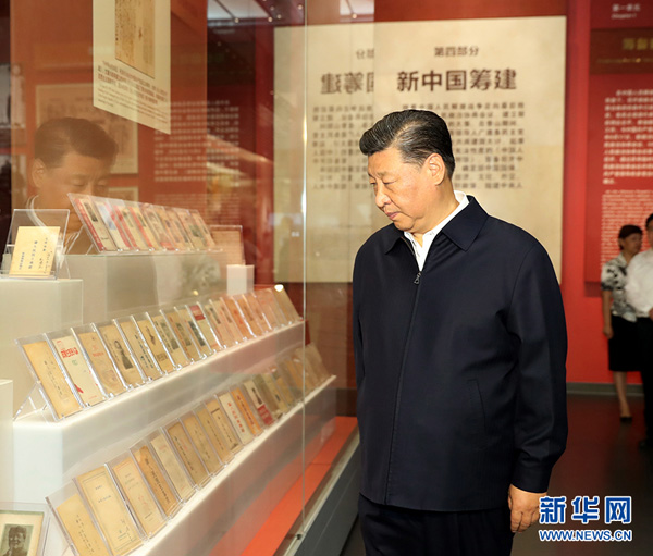 9月12日,中共中央总书记、国家主席、中央军委主席习近平视察中共中央北京香山革命纪念地。这是习近平在香山革命纪念馆参观《为新中国奠基》主题展览。 新华社记者 黄敬文 摄