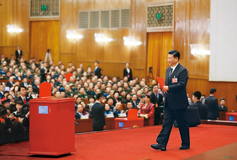 2018年3月17日,十三届全国人大一次会议在北京人民大会堂举行第五次全体会议。习近平当选中华人民共和国主席、中华人民共和国中央军事委员会主席。这是习近平准备投票。新华社记者 兰红光/摄