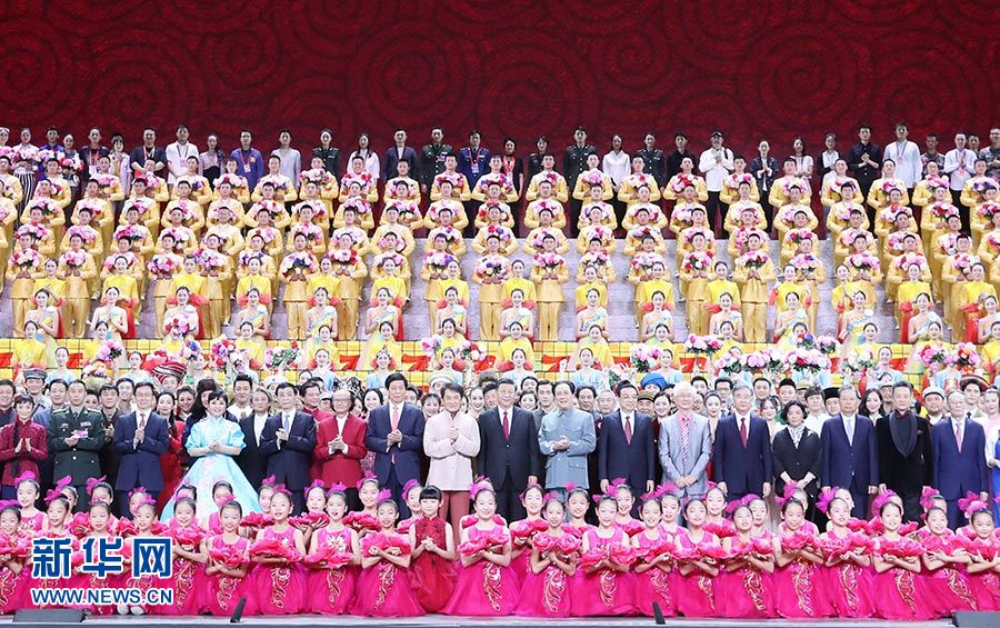 9月29日,庆祝中华人民共和国成立70周年大型文艺晚会《奋斗吧 中华儿女》在北京人民大会堂举行。习近平、李克强、栗战书、汪洋、王沪宁、赵乐际、韩正、王岐山等党和国家领导人同4000多名观众一起观看演出。演出结束后,习近平等走上舞台同演职人员合影留念。 新华社记者 王晔 摄