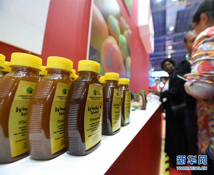 11月6日,在上海举行的第二届中国国际进口博览会上,人们了解赞比亚蜂蜜。 新华社记者 尹炣 摄