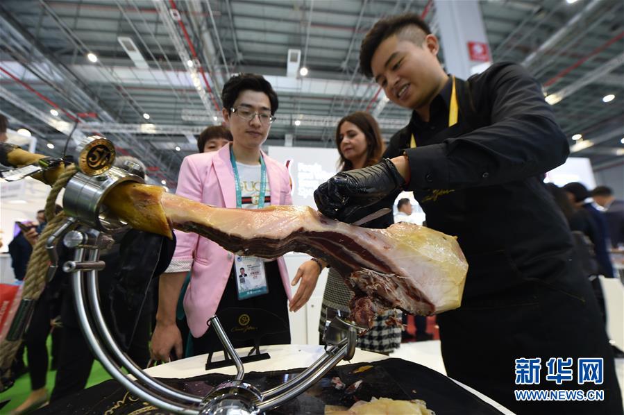 11月6日,在上海举行的第二届中国国际进口博览会上,参观者等待品尝西班牙火腿。 新华社记者 尹炣 摄
