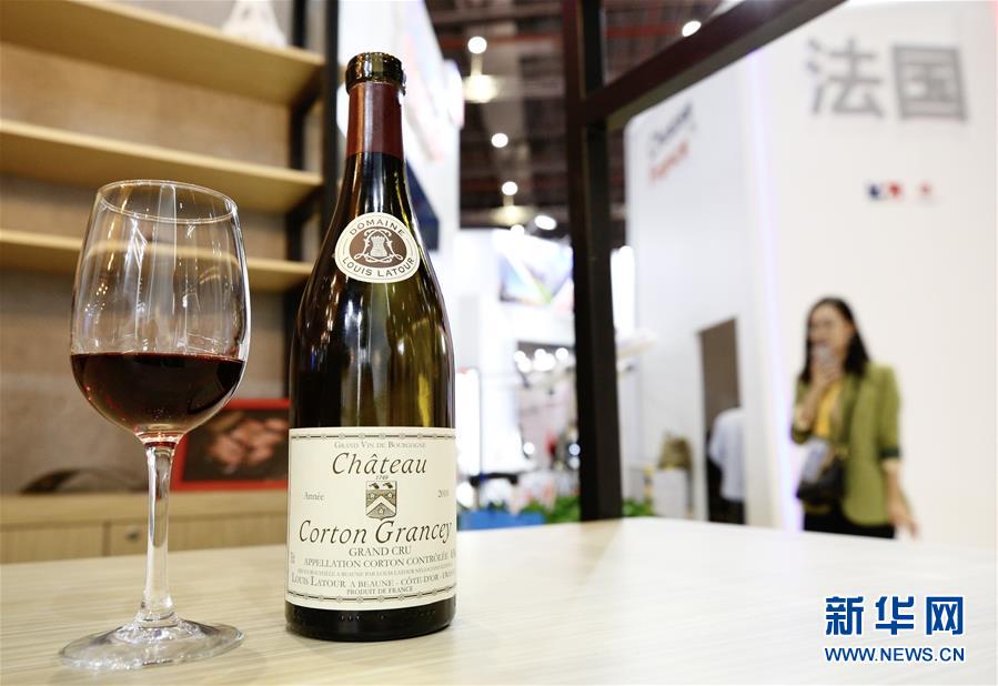 11月5日在第二届进博会法国国家馆拍摄的法国路易拉图科尔登-格兰塞干红葡萄酒。 新华社记者 张玉薇 摄