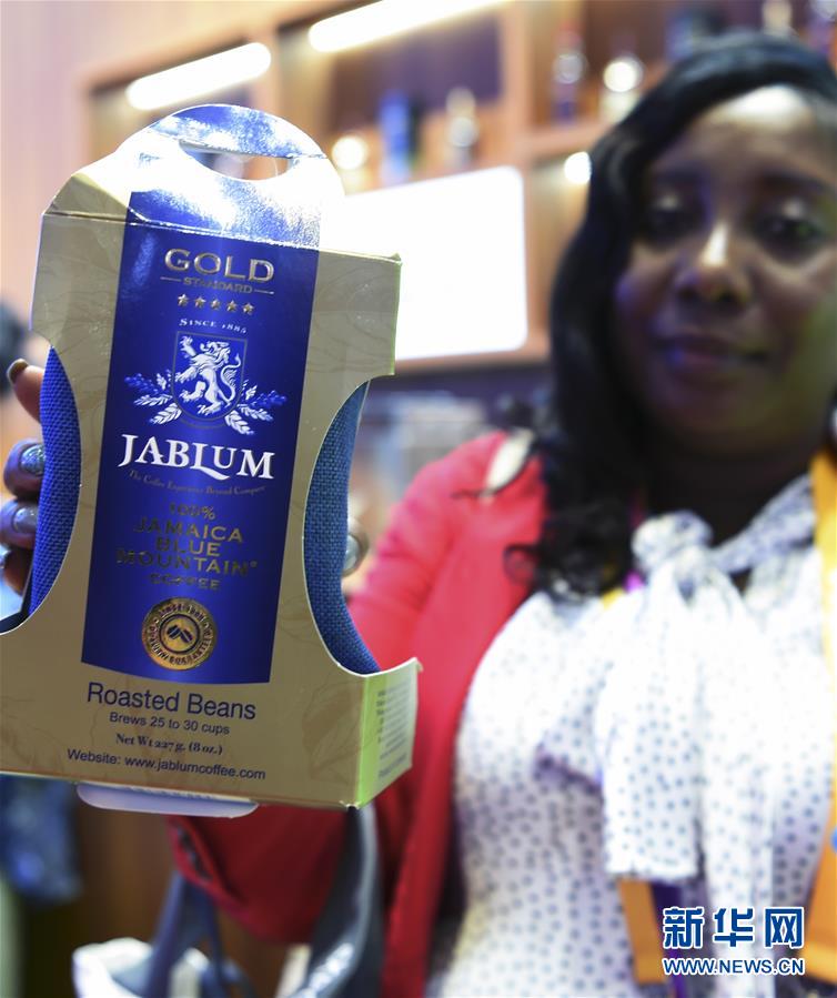 11月6日,在第二届进博会牙买加国家馆,参展商展示蓝山咖啡产品。新华社记者 范培珅 摄