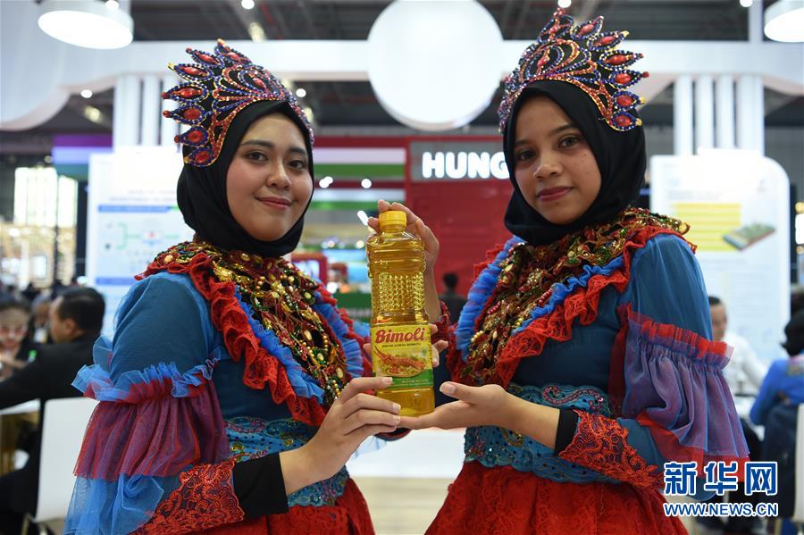 11月6日,在第二届进博会印度尼西亚国家馆,工作人员展示棕榈油产品。 新华社记者 范培珅 摄