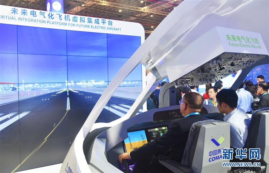 11月6日,在第二届进博会中国馆“创新中国”单元的未来电气化飞机虚拟集成平台,观众在体验中国商飞大型客机模拟驾驶舱操作。 新华社记者 魏海 摄