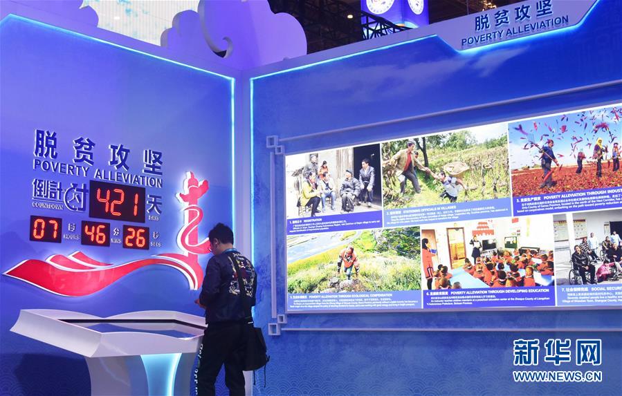 11月6日,观众在第二届进博会中国馆“美丽中国”单元脱贫攻坚倒计时显示屏前参观。 新华社记者 魏海 摄