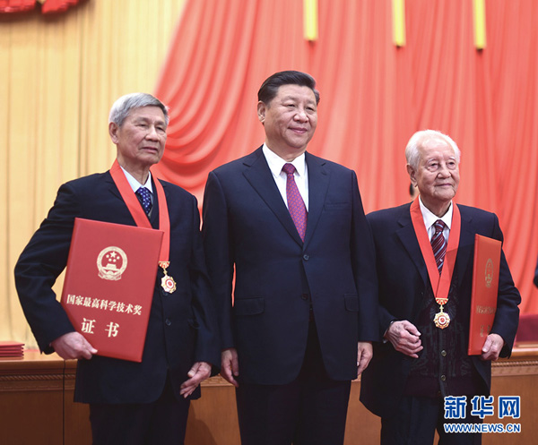 1月10日,2019年度国家科学技术奖励大会在北京人民大会堂隆重举行。中共中央总书记、国家主席、中央军委主席习近平向获得2019年度国家最高科学技术奖的原中国船舶重工集团公司第七一九研究所黄旭华院士(右)和中国科学院大气物理研究所曾庆存院士(左)颁奖。 新华社发(盛佳鹏 摄)