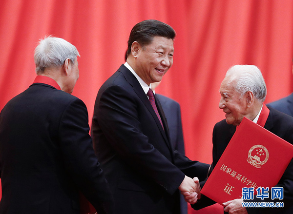 1月10日,2019年度国家科学技术奖励大会在北京人民大会堂隆重举行。中共中央总书记、国家主席、中央军委主席习近平向获得2019年度国家最高科学技术奖的原中国船舶重工集团公司第七一九研究所黄旭华院士颁奖。 新华社记者 李学仁 摄