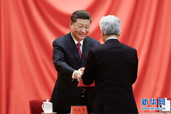 1月10日,2019年度国家科学技术奖励大会在北京人民大会堂隆重举行。这是习近平等党和国家领导人同获得2019年度国家最高科学技术奖的原中国船舶重工集团公司第七一九研究所黄旭华院士和中国科学院大气物理研究所曾庆存院士一道,为获得国家自然科学奖、国家技术发明奖、国家科学技术进步奖和中华人民共和国国际科学技术合作奖的代表颁发证书。 新华社记者 李学仁 摄
