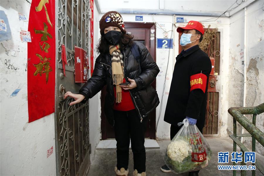 湖北省武汉市江岸区花桥社区志愿者蒋晨一(左)和下沉社区的干部谢文先来到一名独居老人家为其送菜(2月20日摄)。 新华社记者 沈伯韩 摄