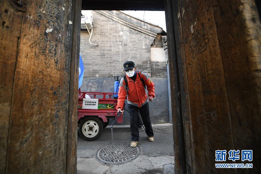 北京市东城区前门街道大江社区志愿者孟连友在青云胡同一处平房院落喷洒消毒液。孟连友从除夕开始,一直在社区做志愿者,负责胡同里的消毒工作(3月10日摄)。 新华社记者 鞠焕宗 摄