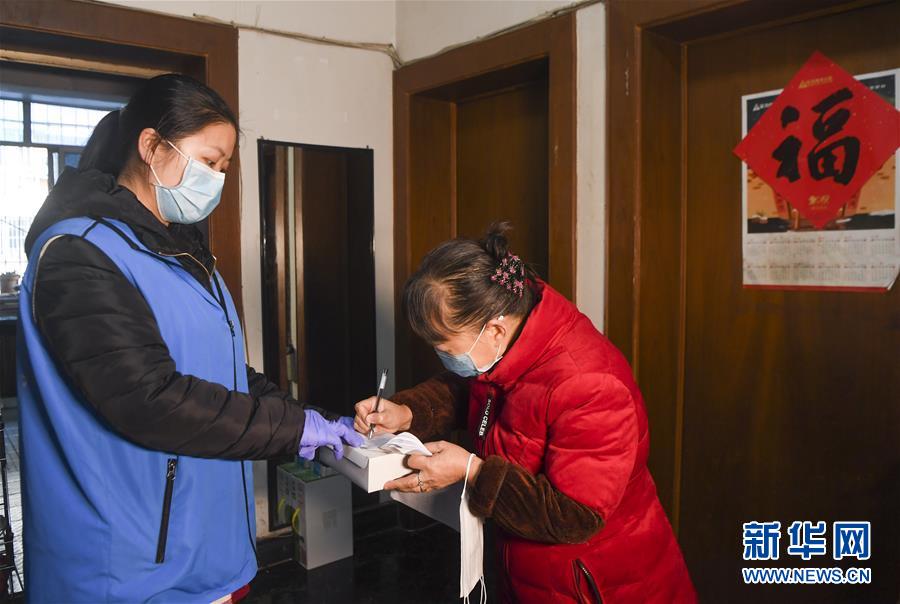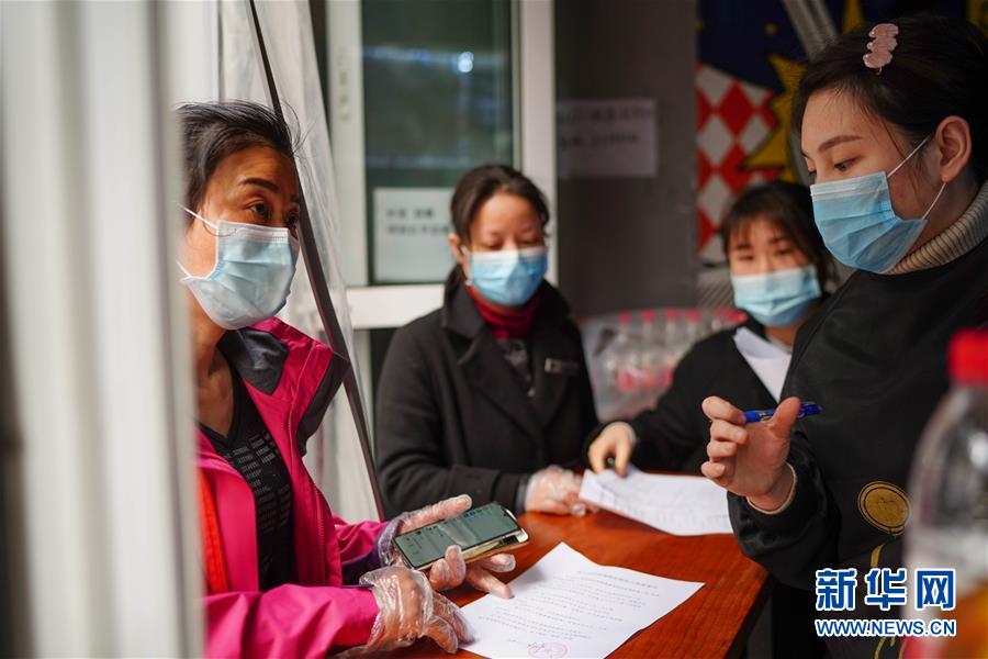 2月19日,重庆市渝北区龙塔街道工农社区工作人员(左)向居民发放口罩。 新华社记者 王全超 摄