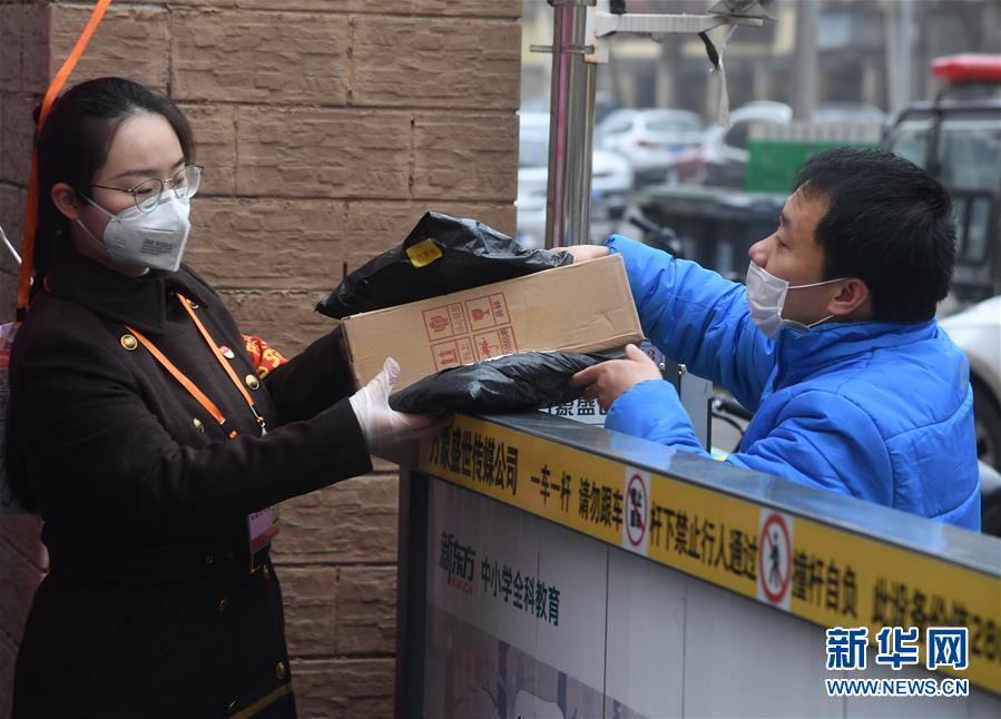 3月8日,在北京市中关村街道白塔庵社区出入口,“90后”志愿者王玥(左)接过快递员送来的社区居民的快递。 新华社记者 任超 摄
