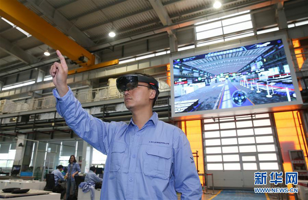 工作人员在中国商飞公司总装制造中心智慧数控车间使用AR眼镜操控虚拟电子屏幕(2018年5月5日摄)。新华社记者 丁汀摄