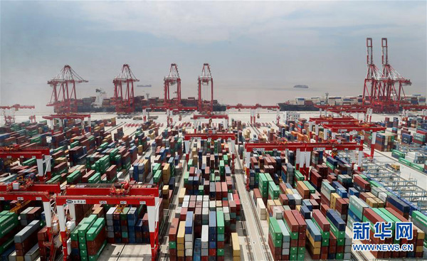 从控制塔中俯瞰上海洋山港四期自动化码头(2018年5月17日摄)。新华社记者 方喆摄