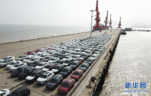 在位于上海临港的上海南港码头,新出厂的汽车等待装船转运(2019年6月27日摄,无人机照片)。新华社记者 方喆摄