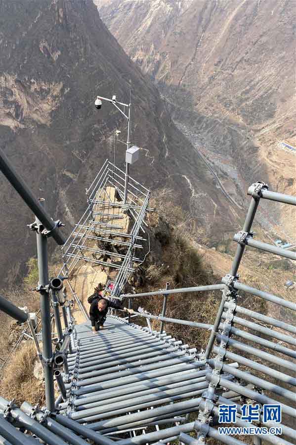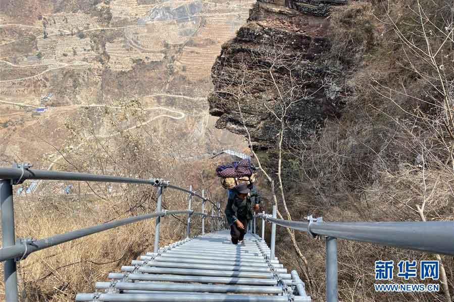 3月23日,一名四川凉山州“悬崖村”村民在攀爬钢梯。新华社记者 吴光于 摄