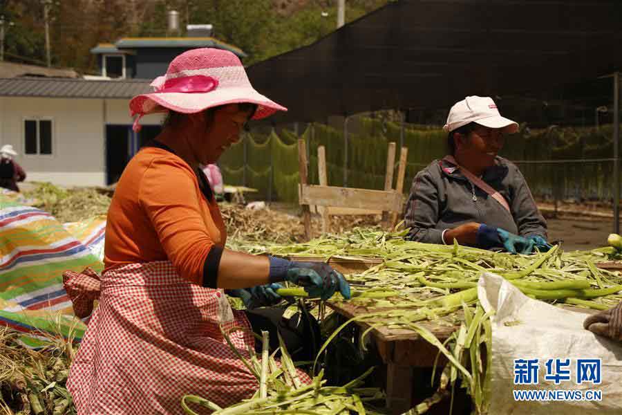 4月9日,在云南省怒江傈僳族自治州兰坪县兔峨乡,贫困户处理采摘下来的贡菜。新华社记者 吴寒 摄