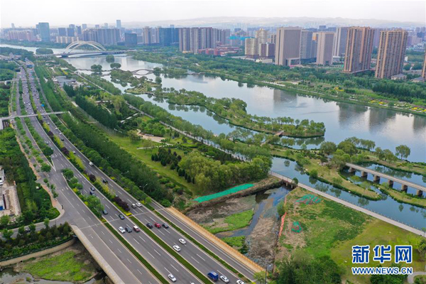 这是山西太原市冶峪河与汾河交汇处附近的景色(5月14日摄,无人机照片)。新华社记者 曹阳 摄